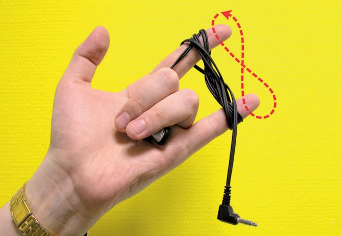 - Между мизинцем и указательным пальцем зажимают начало наушников, а провод начинается наматываться на пальцы восьмеркой.