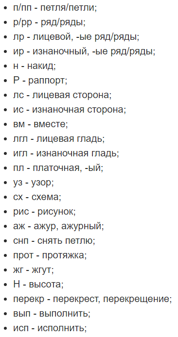 В любой инструкции по вяз содержатся схемы узоров и описания к моделям, в которых задействованными оказываются условные обозначения (графические) и буквенные сокращения. Перечень символов велик, поэтому вряд ли кому-то удастся заучить его целиком. Да в этом нет никакой надобности, поскольку в инструкциях всегда есть соответствующие пояснения. Правда, они не содержат расшифровок базовых значений, вот их запомнить можно, ведь этот список гораздо короче полного: