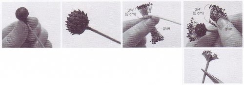 Далее нужно взять пучок тычинок и покрасить их темно-фиолетовый цвет. Затем обрезать их, оставив нужную длину, нанести клей и приклеить вокруг сердцевины цветка.