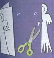 Полосу на меже платья и крылышка необходимо удалить ластиком. Вслед за всем выше описанным вырезать с помощью ножниц фигурку из бумаги. Задекорировать платье ангелочка можно, украсив его ажурным декорированием низа платья из вырезанных симметрично мелких рисунков на месте сгиба фигурки. Всевозможные формы крылышек, ажурный рисунок костюма создадут каждого ангелочка своеобразным и оригинальным.