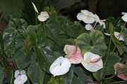 Другой вид – антуриум шерцера – тоже бывает белым. Именно этот вид лучше адаптирован к разведению в домашних условиях. Он имеет короткий стебель, листья у него темно-зеленые и матовые, на них имеются темные точки. Он очень хорошо цветет и при этом белые цветы обычно возвышаются над листвой. Это придает особый эффект и красоту растению. Он способен одновременно выдавать по нескольку соцветий.