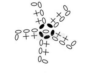 Повторить от * до * один раз, соединительный столбец, один столбец без накидки, провяжите в полустолбец (один полустолбец + один столбец с накидкой), в столбец с накидкой провяжите (один полустолбец с двумя накидками + два столбца с двумя накидками), в полустолбец с двумя накидками провяжите три столбца с двумя накидками, в следующие два столбца с двумя накидками провяжите по три полустолбца с тремя накидками, в полустолбец с двумя накидками провяжите три столбца с двумя накидками, в столбец с накидками провяжите (два столбца с двумя накидками + один полустолбец с двумя накидками), в полустолбец провяжите (один столбец с накидкой + один полустолбец), один столбец без накидки. Закончить следует соединительным столбцом.