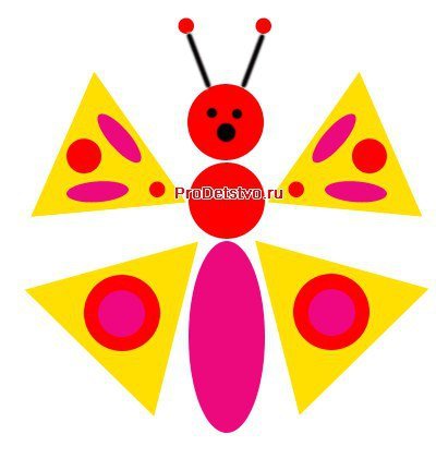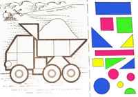 | 4-5 лет | Средняя | Квадрат, прямоугольник, треугольник, круг, ромб, трапеция. Домик с окнами и дверью, паровозик с вагончиками, бабочка (круг-туловище, крылья из разных фигур) |