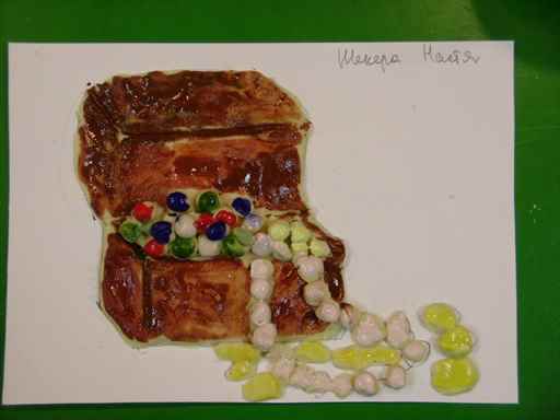 | Крупы (рис, гречка, пшено) | Морской пейзаж | Горизонт из крупного риса, волны из мелкого, кораблик из гречки, солнце из пшена |