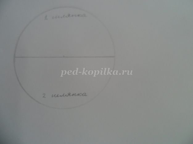 1. Сделаем шляпку гриба. Для этого нарисуем окружность диаметром в 5 см и разделим пополам. Вот уже две шляпки есть, осталось всего четыре.