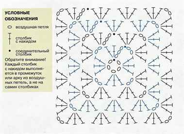 Во всех остальных рядах вязка идет по рисунку, то есть над воздушными петлями вяжутся три столбика с накидом, между этими тройками провязываются воздушные петли в количестве двух штук.