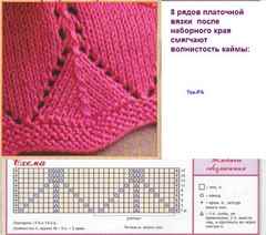 - Ряд 1: кромочная, 1 лицевая, 1 накид, 1 лицевая, 1 накид, 2 вместе лицевой, повторять от * до * до конца ряда, кромочная.