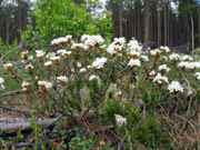 Болотный. Растет в местах с умеренным климатом. Внешне это куст, высота которого составляет сто двадцать сантиметров. На побегах у него ворсинки рыжего цвета. Ветки приподняты вверх. Листья имеют темный зеленый оттенок. Обладает дурманящим ароматом. Цветет он плотными щитинками или зонтиками с белыми цветами. Период цветения – весна.