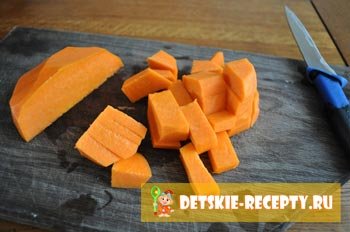 - Тыкву необходимо тщательно вымыть, очистить от семян и нарезать на небольшие кусочки. Это поможет ускорить процесс варки.