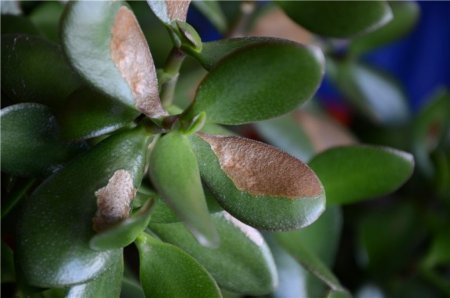 На листьях толстянки могут появляться точки. Если они черного цвета, это значит, что растение получило ожог от солнца. Обычно такие листья сами отпадают и вырастают новые. Если пятна имеют коричневый оттенок, это значит, что цветок подвергся воздействию грибка, для лечения необходимо купить специальное средство и обработать им деревце 1-2 раза. Но пораженные места надо удалить, иначе грибок распространится на другие части толстянки.