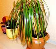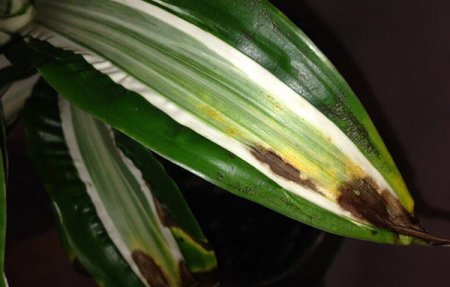 Если цветок стал терять свою насыщенность, зеленый цвет листьев становится бледным, а на всей их поверхности появляются пятна, это значит, что драцена получила ожоги от солнца. Случается такое по причине долгого пребывания горшка под солнечными лучами, особенно, если перед этим листья опрыскали водой. Чтобы вылечить растение, нужно переставить его в другое место, где нет солнца, и дождаться, пока листья начнут снова зеленеть.