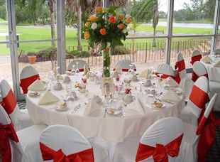 Столы и стулья чаще всего накрываются скатертями светлых тонов с кружевами или каким-либо рисунком. Сейчас модно делать специальные чехлы, которые украшают не только стол, но и стулья. Их можно сделать своими руками, пошить на заказ или взять напрокат. Чаще всего они выполняются из одной плотной скатерти и украшаются легкой органзой или шифоном в виде волн, зигзагов, цветов. Также не забывают делать цветочные аппликации, вся ткань должна соответствовать заданной цветовой гамме.