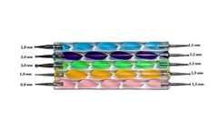 «Dots» в переводе с английского языка – «крапинки», «точки». С помощью этого инструмента на ногти можно нанести разнообразные декоративные элементы. Он представляет собой пластиковый или прорезиненный стержень длиной примерно 15 см с концами из металла, на которых находятся 2 шарика разных диаметров.