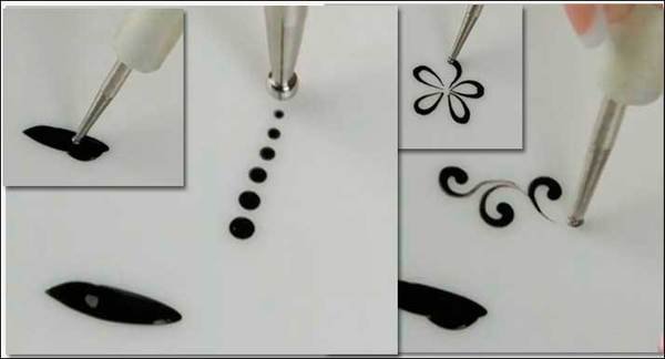 С помощью фото можно увидеть, что дотс также позволяет делать разные запятые и завитушки, начинающиеся с обычной точки. При этом движения рукой должны быть плавными и аккуратными, иначе маникюр может испортиться.