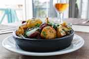 - Картошку почистить и нарезать большими кусками. Бекон нарезать тонкими пластинами.