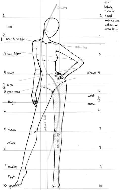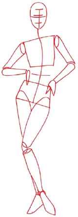Если задумана фигура с уклоном левее с руками на бедрах, то рисуем прямую черту равновесия в центре листа, тянем черту от головы до площади, где она находится. В эскизах внимание заостряется не на фигуре или лице, а на изделиях, вырисовываются все мелкие детали изделия.