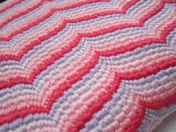 В баржделло, ряды вышиваются сначала одним цветом, затем другим и по одному курсу. Каждый из последующих стежков, необходимо опустить либо поднять на пару ниток по отношению к предыдущему.