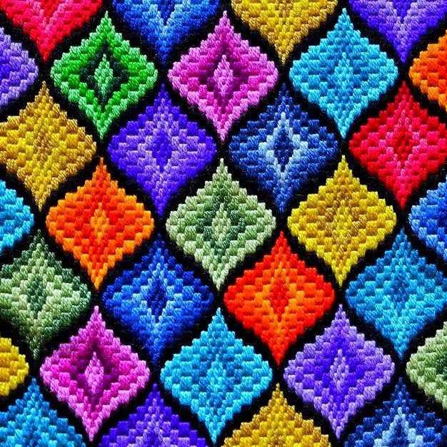 Один из старинных способов нанесения вышивки на ткань — барджелло. Она еще носит название флорентийская, пламенная и другие, не менее яркие и образные. Если вы увидите название итальянская, речь идет о той же вышивке. Традиционно bargello используется для формирования объемных орнаментальных рисунков. При этом очертания фигур могут быть как острыми, так и сглаженными до округлостей. Барджелло несколько напоминает распространенную вышивку гладью, хотя предоставляет гораздо меньшую свободу по направлениям и размерам каждого отдельного стежка, зато позволяет гораздо больше играть с цветовыми переливами и формами.