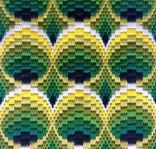 Еще один популярный стежок bargello получается в результате зеркального отражения зигзага от верхней части к нижней. В результате, получаем полоску с ромбами, имеющими острые углы. Такой узор называют «карнация». Вышивается данный орнамент барджелло одним оттенок нитей относительно всей длины узора, после чего вводит другой тон.