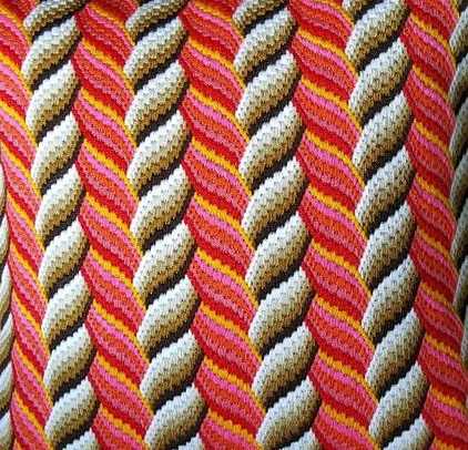 За основу берется четыре разных оттенка нити одного цвета для пузырьков и три оттенка нити другого цвета для ромбов.