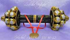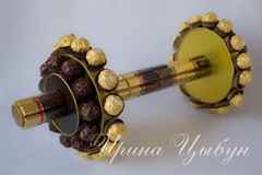 После этого двухсторонним скотчем приклеиваются конфеты в два ряда. Они изображают одетые на штангу блины. Лента приклеивается к медали и вешается на гантель. Таким образом, подарок можно считать готовым. Он порадует своей оригинальностью, а также обилием сладкого. К тому же, будет оценено ваше старание сделать подарок незабываемым.