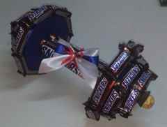 По такому же принципу можно изготовить гантель из сникерсов. Для этого нужно запастись картоном, конфетами Сникерс, тёмно-синей гофрированной бумагой, CD или DVD диском, двухсторонним скотчем, клеем и зажигалкой. Помимо этого нужна атласная лента и шоколадная медалька.