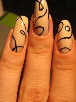 Чтобы выполнить тонкий рисунок, можно воспользоваться зубочистками. Для оформления случайных линий можно использовать лак черного цвета. Наносятся они от основания ноготка – это будет отправной точкой. Лака необходимо брать в малом количестве, дабы не получились кляксы вместо линий. Так как линии должны быть тоненькими, то прорисовывать их необходимо иглой или тоненькой кисточкой.