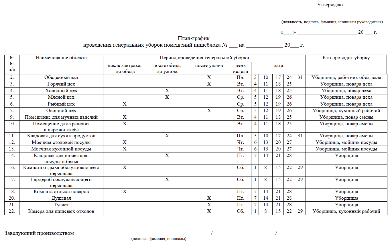 График проведения генеральных уборок в общепите: Образец