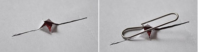 Крепление будет проходить также как и с булавкой. Откусите щипцами часть скрепки, чтобы ее концы стали острыми и воткните в стену, обои или на кусочек плотной бумаги. Эксперимент показал, что скрепка выдерживает вес картины до 1-го килограмма.