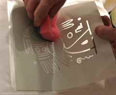 Нанеся рисунок, трафарет надо аккуратно снять. Картон не следует вынимать, пока краска полностью не высохнет.