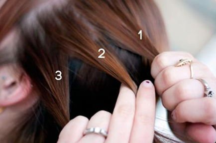 Возьмите на макушке прядь волос. Чем толще прядь, тем объемней получится коса. Разделите ее на три части (1- правая; 2- средняя; 3- левая).