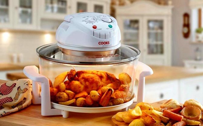 В основе аэрогриля – электрическая печь, которая подогревает продукты не снизу, а сверху. Прибор представляет собой круглую стеклянную емкость объемом 6-17 л на пластиковой подставке. В комплект входит крышка диаметром 300-450 мм. Внутрь прибора помещают решетку или противень для продуктов, которые выкладывают сверху в натуральном виде или предварительно заворачивают в фольгу.