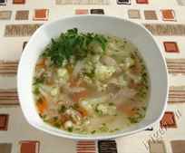 Сначала опустить в бульон кусочки цветной капусты, а затем добавить остальные овощи и специи.