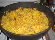 Основной секрет рассыпчатого плова заключается в том, что рис должен быть длиннозернистый, и не забывайте его замачивать. И после того, как положили рис, не мешайте блюдо, от этого портится структура риса и он становится кашеобразным.