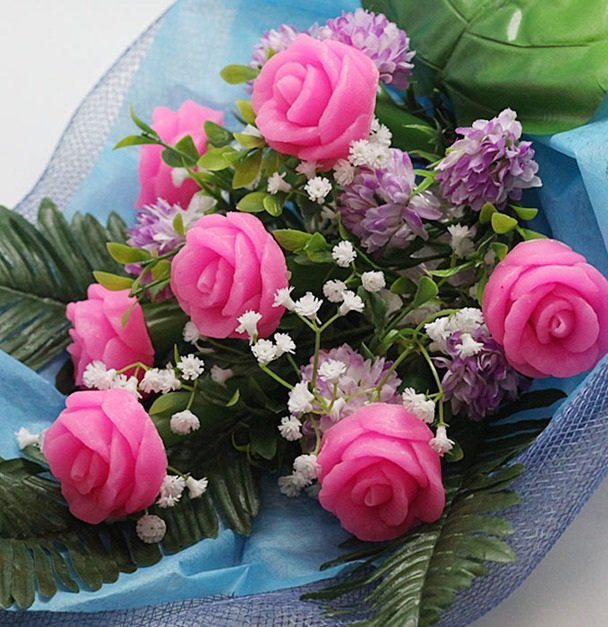 - мыло в виде цветов. Вы можете собрать букет, в котором будут розы и еще несколько других цветов, а можно выбрать только тот сорт, что нравится тому, кому будет преподнесен подарок. Так делаем и с ароматом мыла;