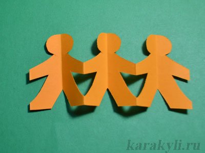 После того, как образ нарисован карандашом, можно приступать к процессу вырезания бумажных человечков. Для этого по контуру одного человечка необходимо вырезать всех остальных, которые сложены в гармошку. После того, как лишняя бумага отрезана, человечков можно растянуть в ряд в виде гирлянды и посмотреть, нет ли каких-нибудь недостатков, которые можно подправить ножницами. Если все человечки идеально ровные и не имеют никаких изъянов, их можно разрезать и сделать несколько отдельных человечков или так и оставить в виде гирлянды.