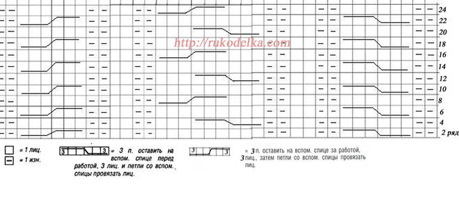5-й ряд: * снимается три (3) петли на добавочную спицу. Спица находится за работой. Лицевыми провязывают последующие 3 петельки, после этого с дополнительной спицы провязывается три петли лицевыми, 2 вяжут изнаночными, три петли перекидывают на добавочную спицу, спица при этом находится впереди работы, последующие три петельки провязывают лицевыми, потом вяжут петли с добавочной лицевыми*;
