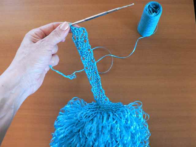 Добавление ручки. Когда основная часть мочалки достигнет желаемого размера, начните формировать ручку. Для этого в конце последнего ряда свяжите 10-15 воздушных петель. Затем вернитесь обратно и свяжите несколько рядов столбиками с накидом, чтобы создать прочную и удобную ручку.