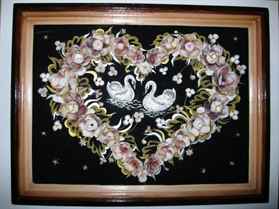 Для начала тонируем стекло-основу темной краской и оставляем высыхать. Далее вставляем в рамку стекло-основу и рисуем изображение. Рисуем сердечко – оно будет выложено цветами из ракушек, в середине рисуем двух лебедей, смотрящих друг на друга.