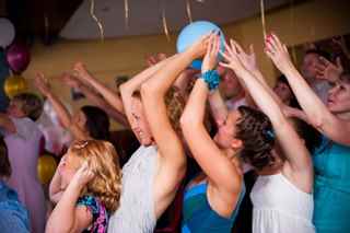 Еще один вариант такого конкурса: шарик зажимается между парой и его нужно поднять на самый вверх, не используя при этом руки.