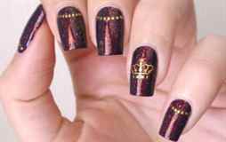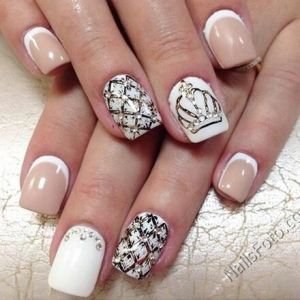 Идей маникюров с короной можно найти множество, и все они очень отличаются друг от друга. Но с самого начала нужно определиться, как будет выглядеть коронах. Это может быть рисунок простой короны, как рисуют дети, в виде трех треугольников, которые связаны между собой основанием. Но если есть время и девушка умеет рисовать, можно нарисовать настоящую корону, которая имеет закругленные стороны, и которую носят настоящие Королевы. Для того, чтобы научиться рисовать такую корону, можно найти видео урок, где пошагово рисуют этот элемент и показывают, как правильно работать кистью и золотым лаком.