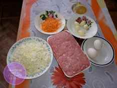 - К овощам добавить фарш, лук, соль, перец (по желанию) и рис (последний можно сначала отварить до полуготовности, а можно и сырой):
