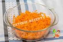 - В огнеупорную стеклянную или силиконовую форму (а можно и в горшочки!) выложить слой морковки, мелко натертой, чуть посолите: