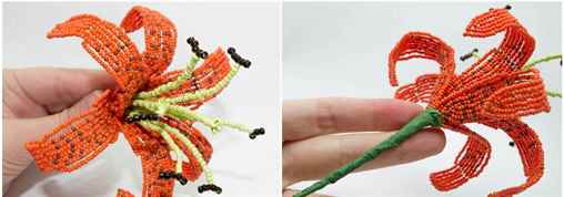 | Оформление стебля и листьев | Зеленая бисерная нить, проволока | Плетем стебель и листья лилии, используя французское плетение или другую технику. |