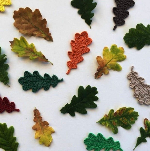 В описании лист связан из трех цветов пряжи – он осенний. По своему желанию вы сможете превратить его в весенний, связав его полностью из зеленой пряжи.