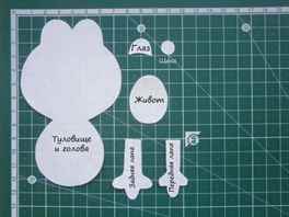 Далее делаем выкройку из фетра. Для этого приложим вырезанные из бумаги контуры на фетровую ткань и обведем их. Животик (одна деталь), глаза (две детали) – это на белом фетре.