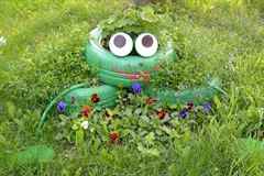 Из шланга и резины сделайте лапки лягушки. На верхней покрышке нарисуйте ротик красными красками. На майонезных крышечках нарисуйте глаза, а из полуторалитровой пластиковой пустой бутылки вырежьте корону и покрасьте желтыми красками. Засадите новую клумбу цветами, получится очень живописно.