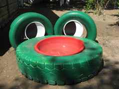 Существует огромное количество поделок из шин для детских площадок. Поэтому у вас есть возможность порадовать своего малыша и сделать своими руками лягушку из шин и установить ее на той площадке, где обычно любит играть ваш ребенок. Или, сделав множество различных поделок, организовать свою детскую игровую площадку.