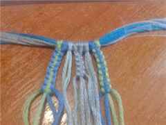 Берем очередные нитки и проплетаем их до центральной части, но не переплетая друг с дружкой. Затем продолжаем процесс работы, но только в конце нитки между собой уже переплетаем. Очередные нитки опять переплетаем. Когда в плетение войдут нитки, расположенные с края, их переплетать не нужно. Теперь берем еще пару крайних ниточек, плетем ими до центральной части, не соединяя.