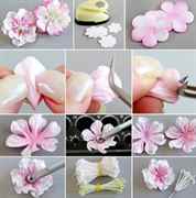 Берем мастику и делаем шарики, далее заостряем один конец шарика, в итоге получаются конусообразные заготовки. Теперь маникюрными ножницами делаем четыре надреза в части, где заготовка шире, в виде лепесточков. Надрезы выполняем крест-накрест. Теперь при помощи стека придаем лепесточкам форму, в результате получается одно соцветие. Такие соцветия очень красиво смотрятся на пирожных. Далее берем проволоку, сгибаем петлю и надеваем на нее цветочек.